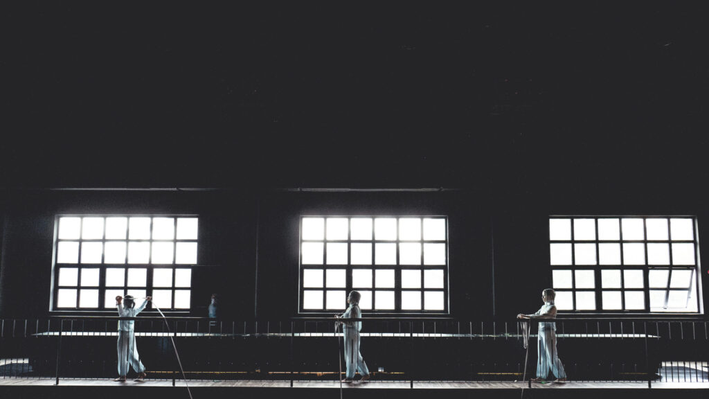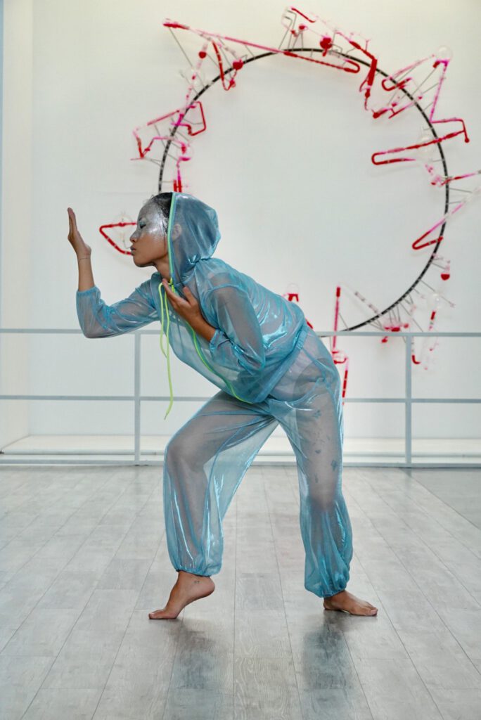 The second movement explores spinning—a gesture choreographed by glass during the process of its becoming. Among the oldest human crafts, spinning converted fiber into thread, evolving condensed mass into a linear order. In the realm of glassblowing, spinning harnesses centrifugal force to create symmetry. As the glassblower rotates a hollow stick with molten glass at its end, she shapes this mass into form. However, this process is time-sensitive; there exists only a brief window of malleability for the glass. Similarly, the human body has an ability to spin and maintain equilibrium only for a limited duration before requiring to reorient itself in space.
