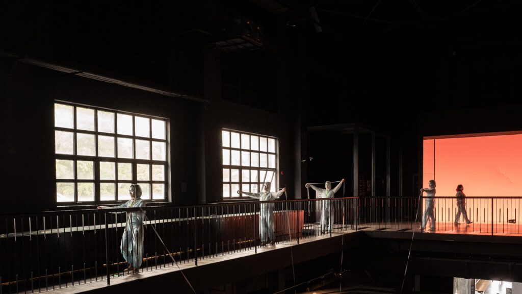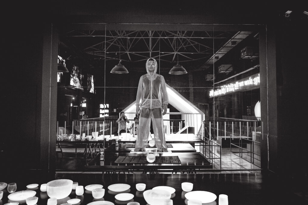 In this performance, held in dialogue with the interactive multimedia installation Fusion, dancer Steph D’Sibö led the audience on an alchemical journey. From the inception of a grain of sand to the fiery flame that melts it, and ultimately to the luminous light that refracts upon encountering glass, she explored the extraordinary metamorphosis inherent in the art of glassmaking.