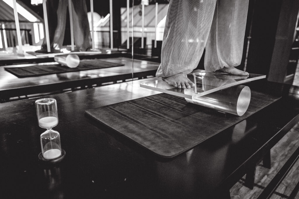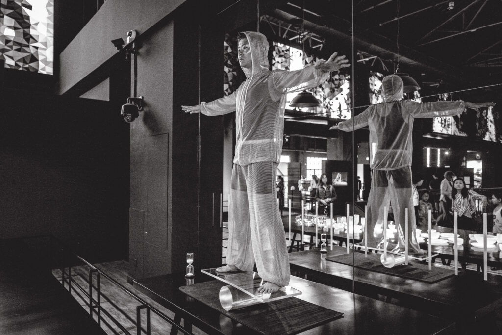 In this movement, professional equilibrist Wang Jiaming embarked on a captivating exploration of equilibrium, pushing the boundaries of physical endurance and concentration. For twenty-four minutes at a time, he aimed to maintain perfect stillness, perched upon a plexiglass board and cylinder amidst a setting of delicate china.